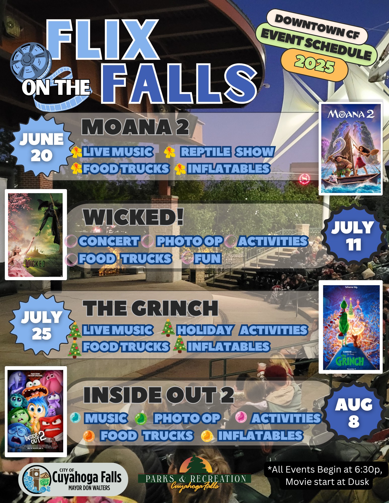 The Cuyahoga Falls Parks & Recreation department is hosting a fun series of FREE events this summer, "Flix on the Falls", on Friday Nights in June and July.